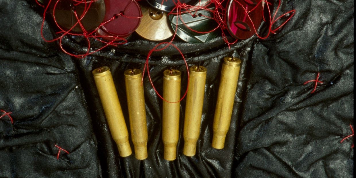 Materials: shell casings, buttons, brass stencils on painted fabric.