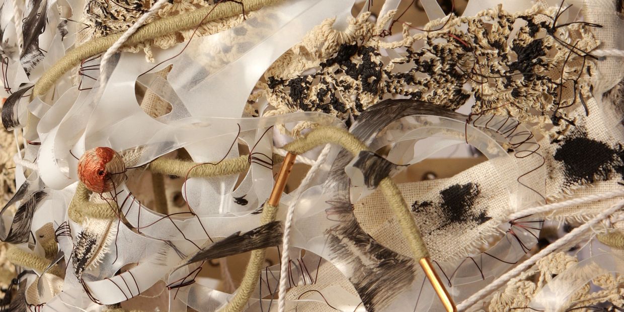 Materials: lace, fabric, plastic six-pack rings, string, eyelet tape, buttons, wire